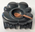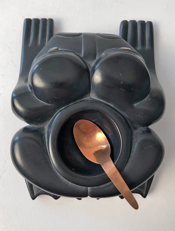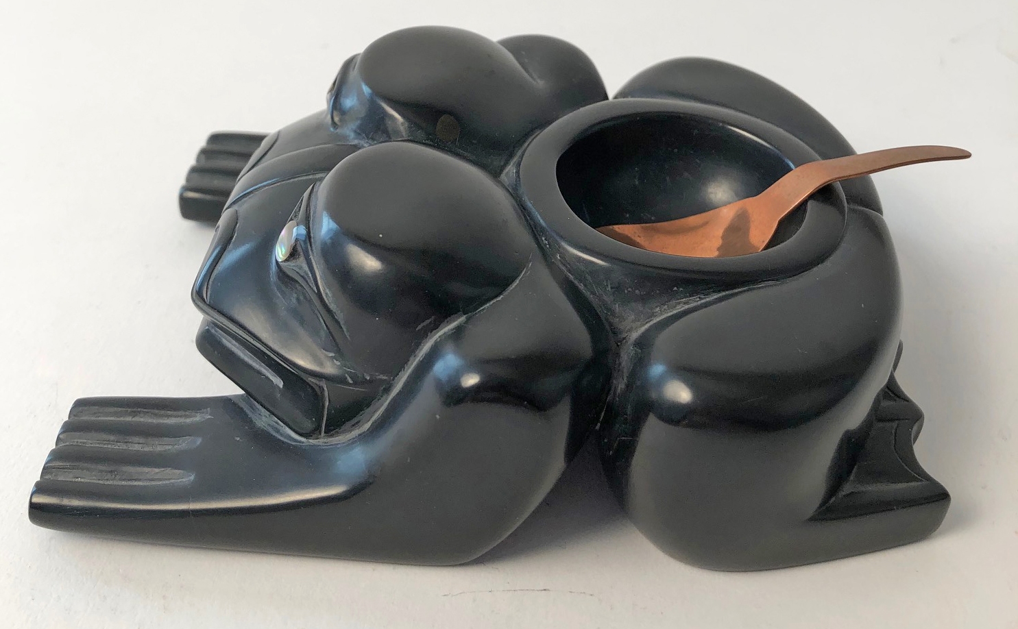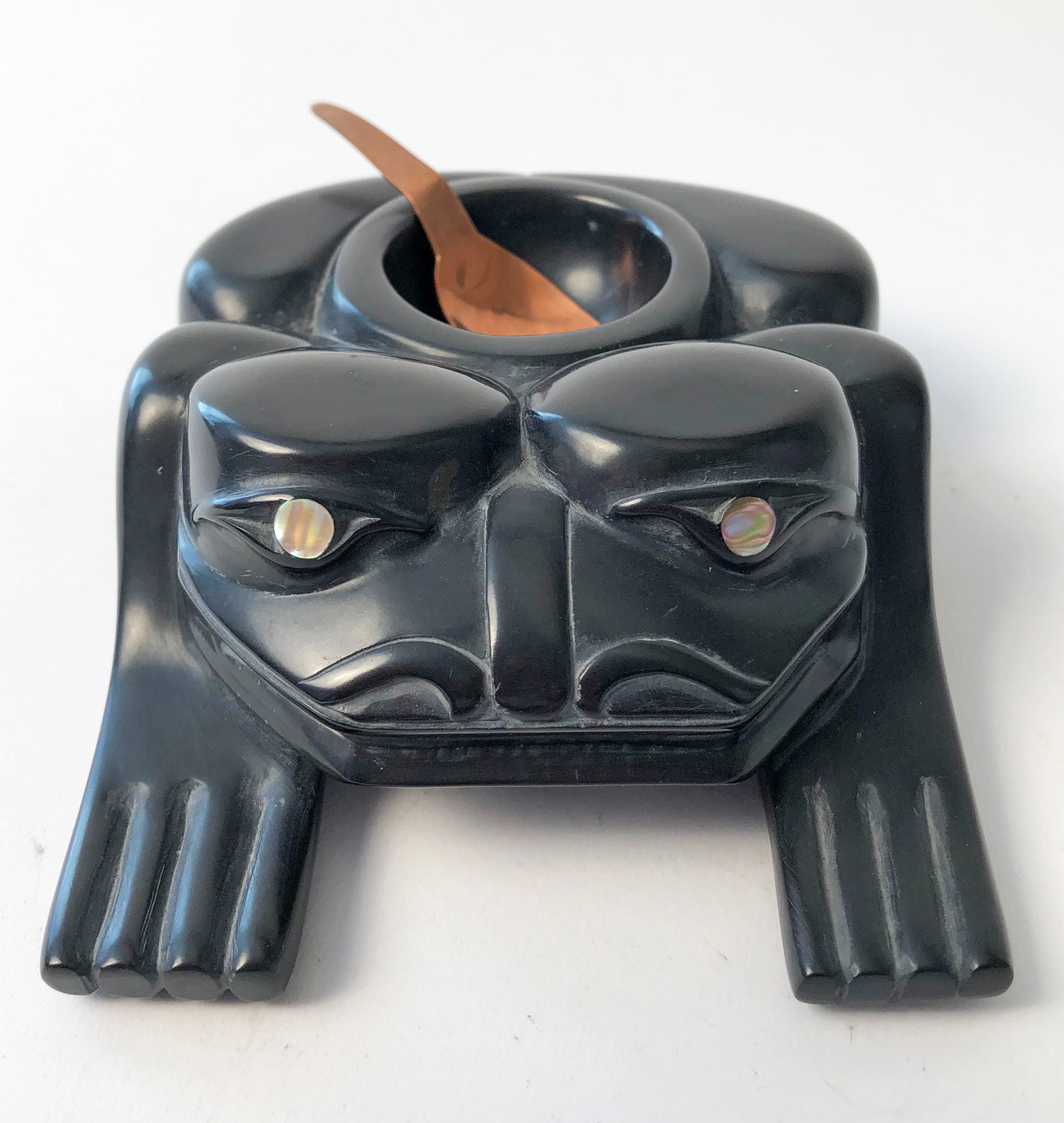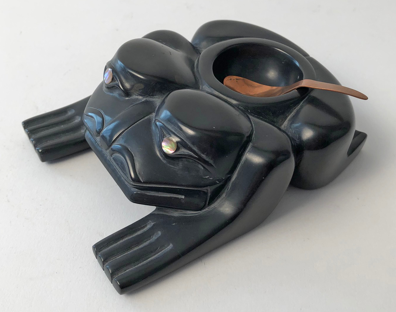 This wonderful argillite frog bowl was carved by Haida artist Kevin Ryland. Kevin uses abalone inlay for the eyes and the bowl comes with a copper spoon.