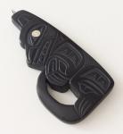 This wonderful pendant features a Northwest Coast Haida wolf design. It is hand-carved by Haida artist Glen Pollard from Haida Gwaii, British Columbia. An original piece, it is a wonderful example of Glen’s distinguished carving style, inlay skill, creativity and expertise working with argillite.