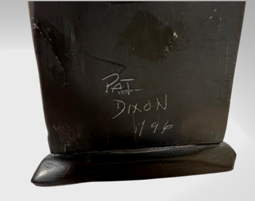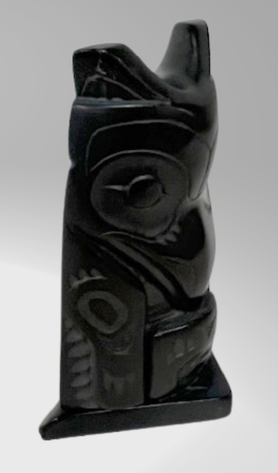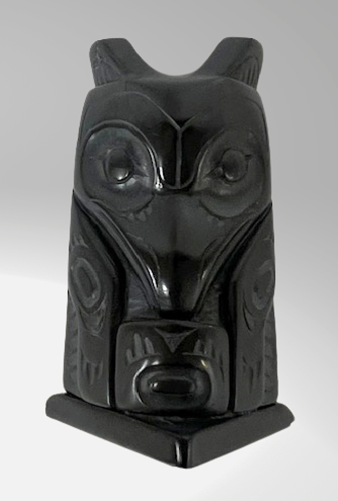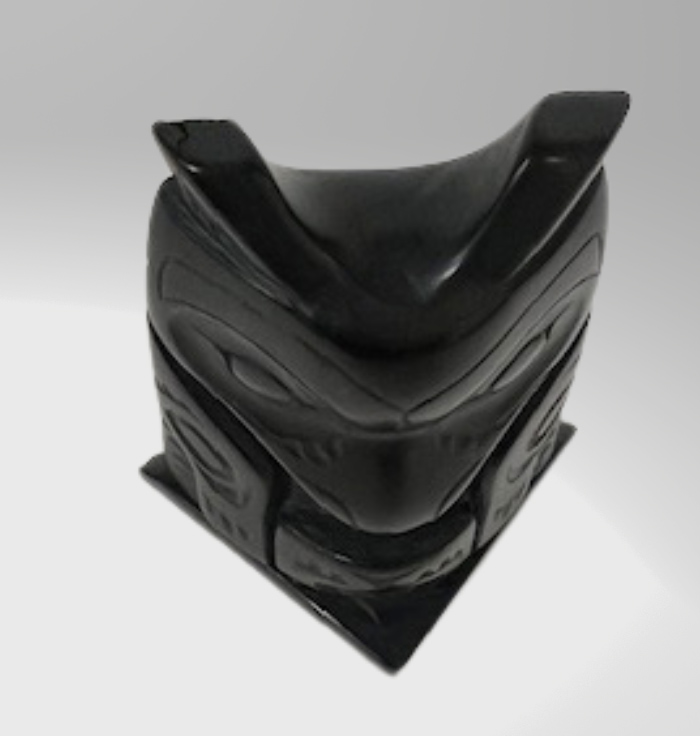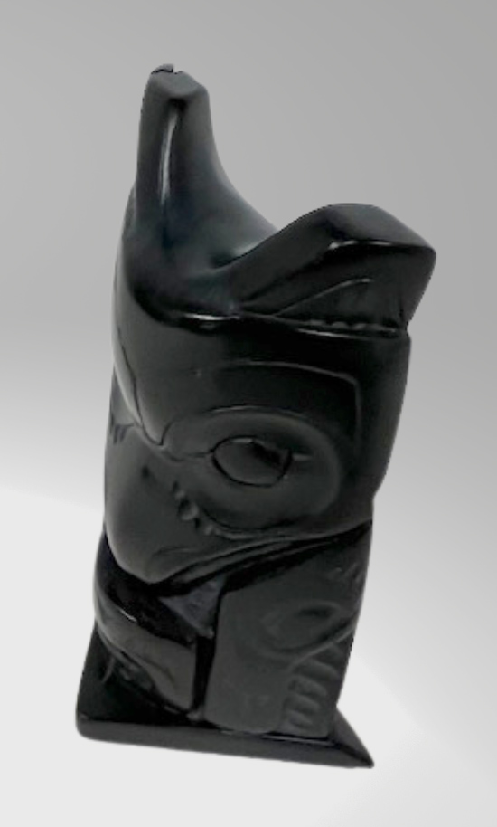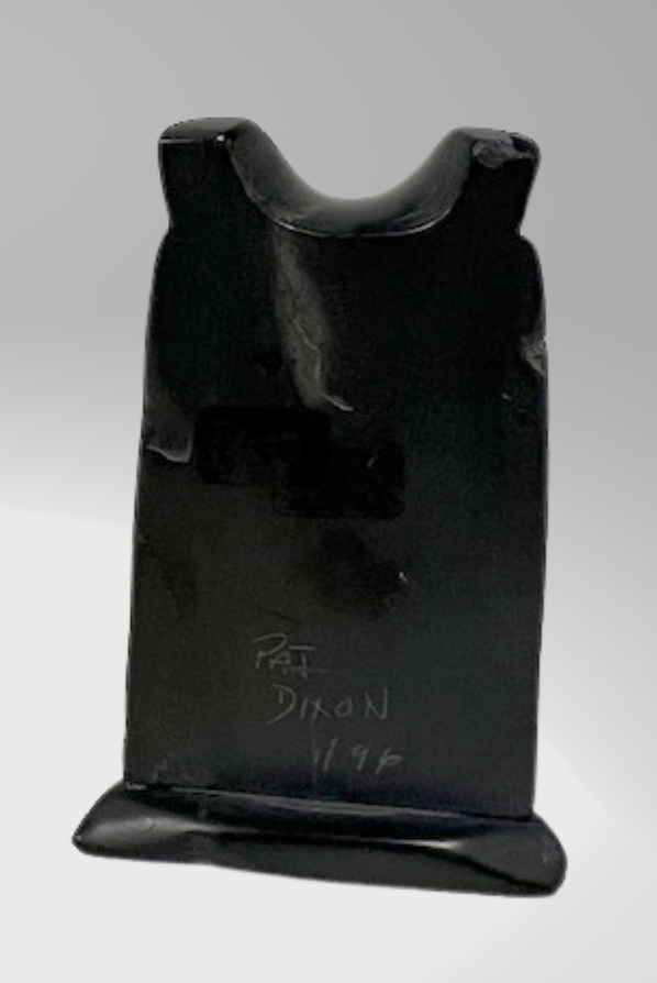 Haida artist Pat Dixon carved this wonderful argilite Northwest Coast raven. Born in Haid Gwaii, British Columbia, Canada, Pat was a member of the Eagle clan. He began carving a young age. In 1966, he moved to Vancouver, BC, where he began working with Haida carver, Pat McGuire. Pat became an established argillite carver creating totem poles, platters, sculptures, and jewellery. He passed away on January 17, 2015.