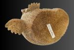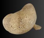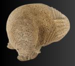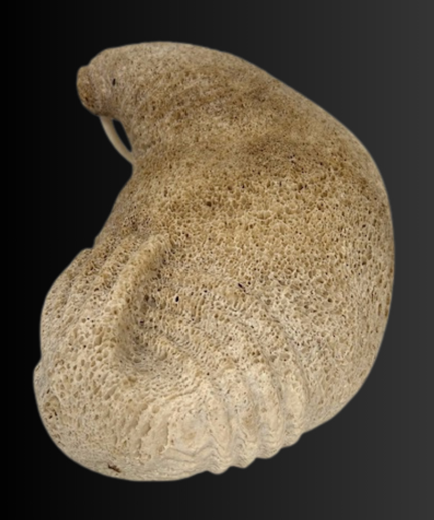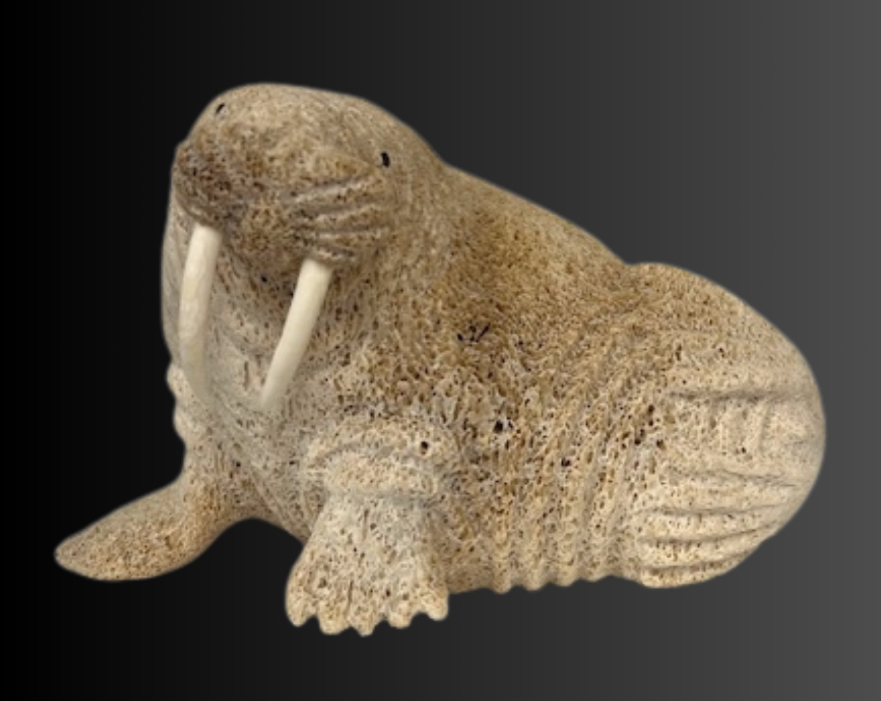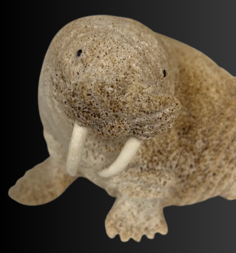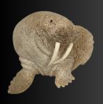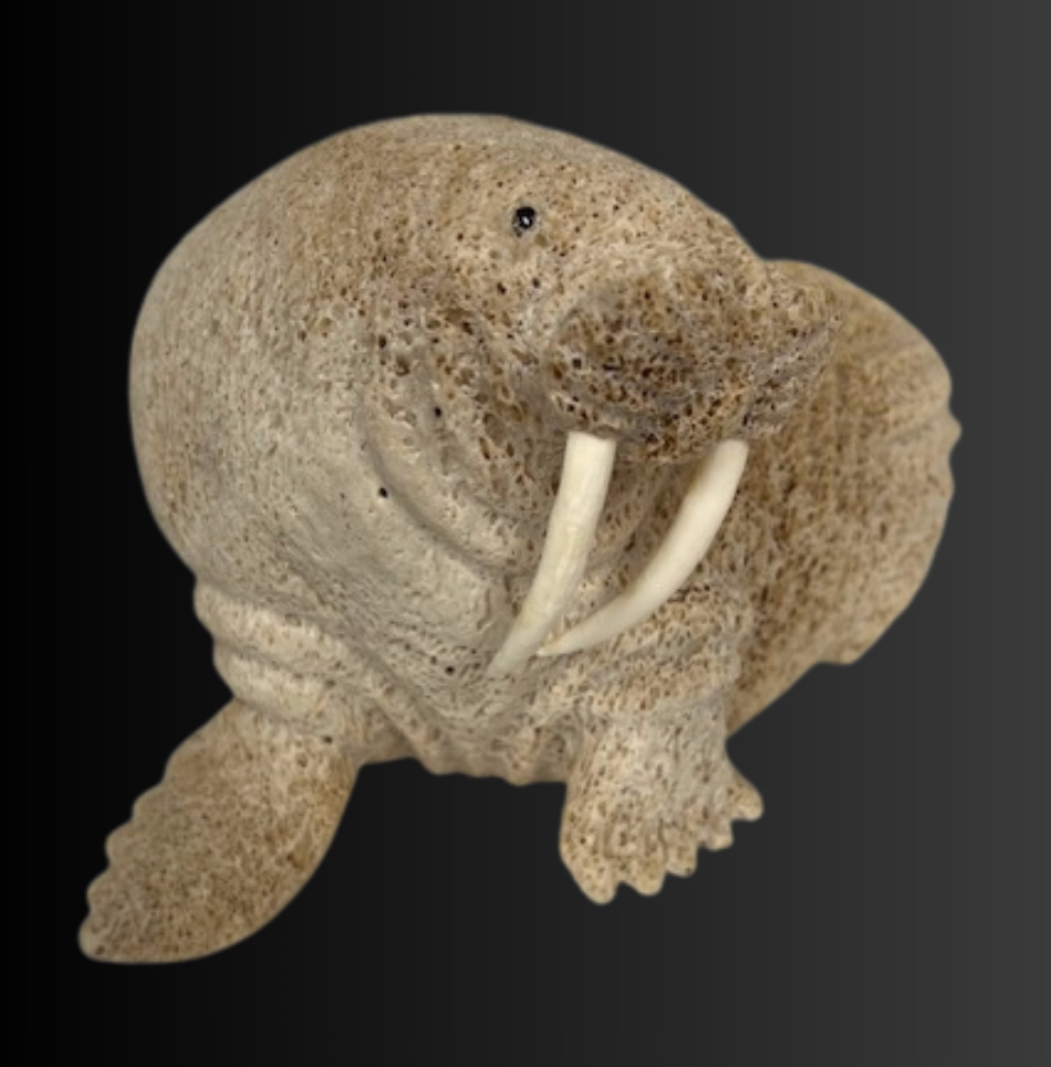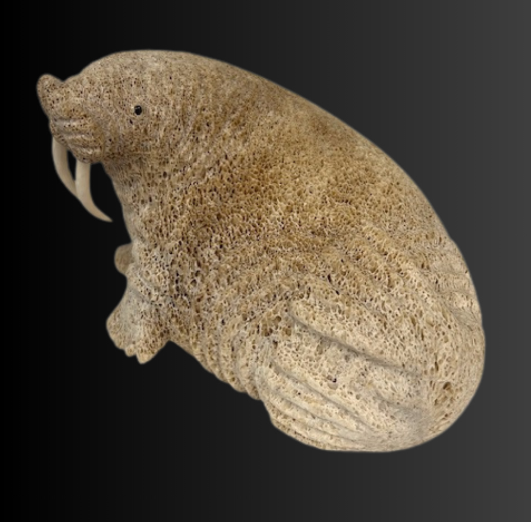 Lewis Iyakitan Jr., a Siberian Yupik from St. Lawrence Island, Alaska carved this wonderful walrus from a beautiful piece of fossilized whalebone. Lewis has used the natural aspects of the whalebone and carved detailed lines depicting the strong body and very thick, tough hide of this walrus. Inlaid baleen define the eyes and carved walrus ivory inserts are used as tusks.