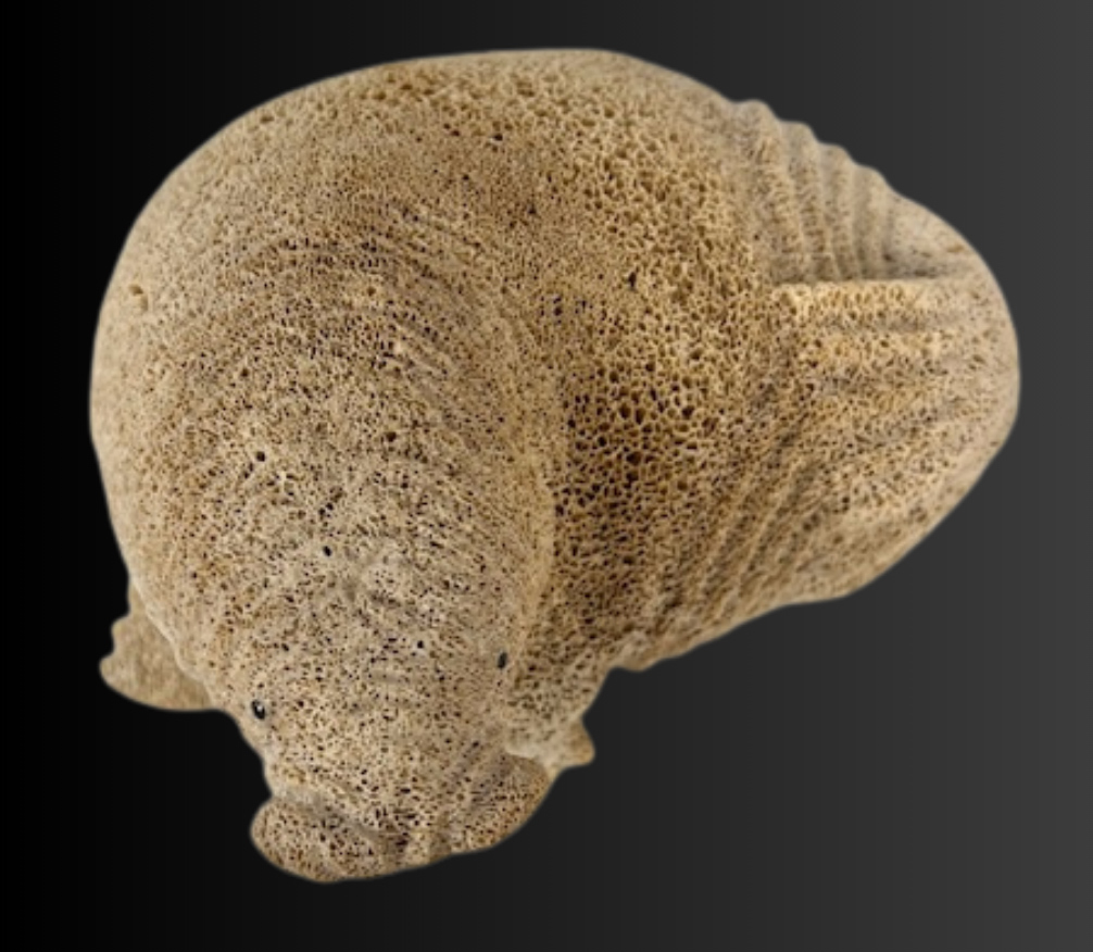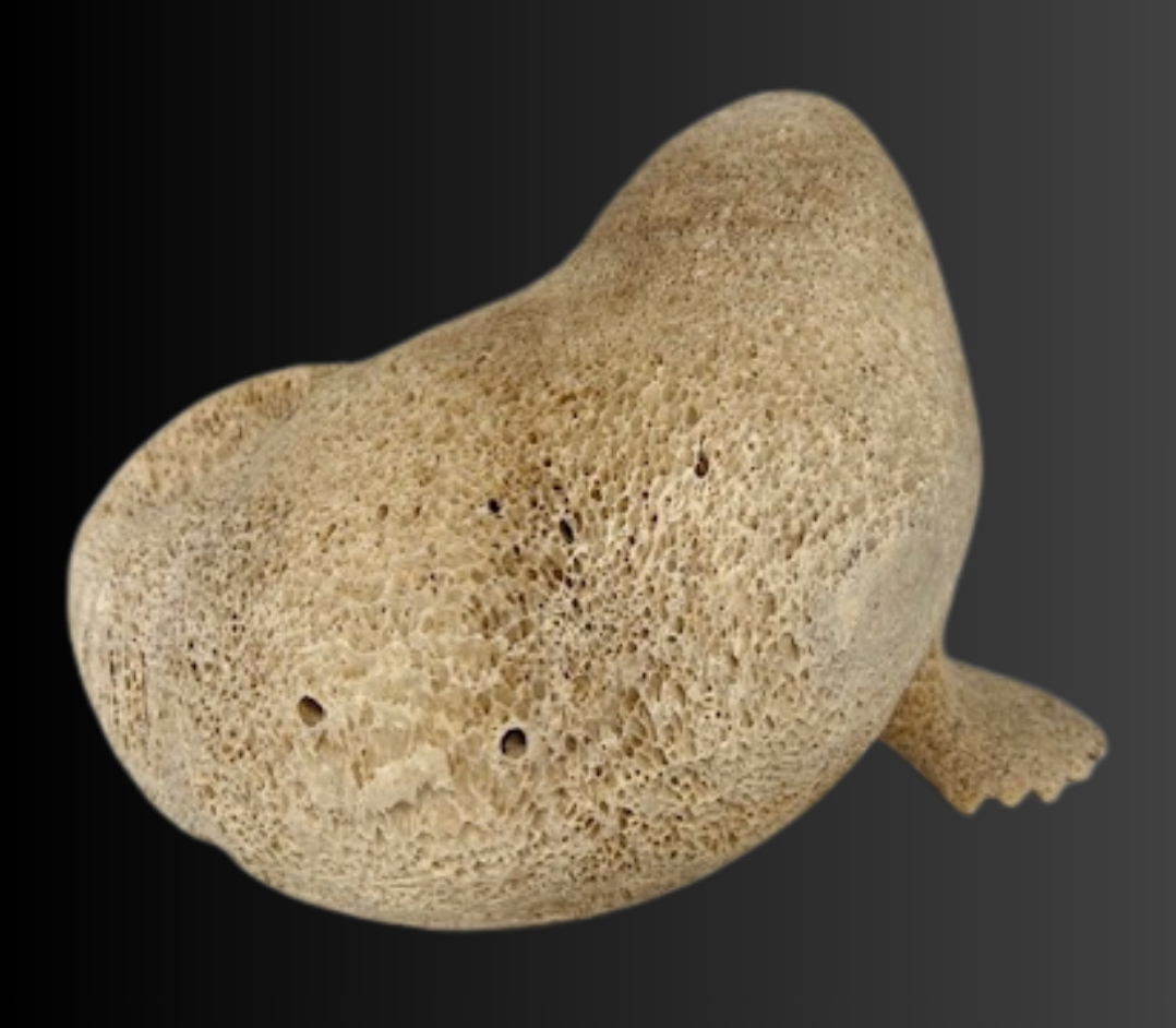 Lewis was introduced to whalebone carving by his father and there is a significant similarity in the carving style of Lewis Sr. and Lewis Jr.’s work. This carving is inspired by his subsistence lifestyle and his connection to the subjects he hunts.