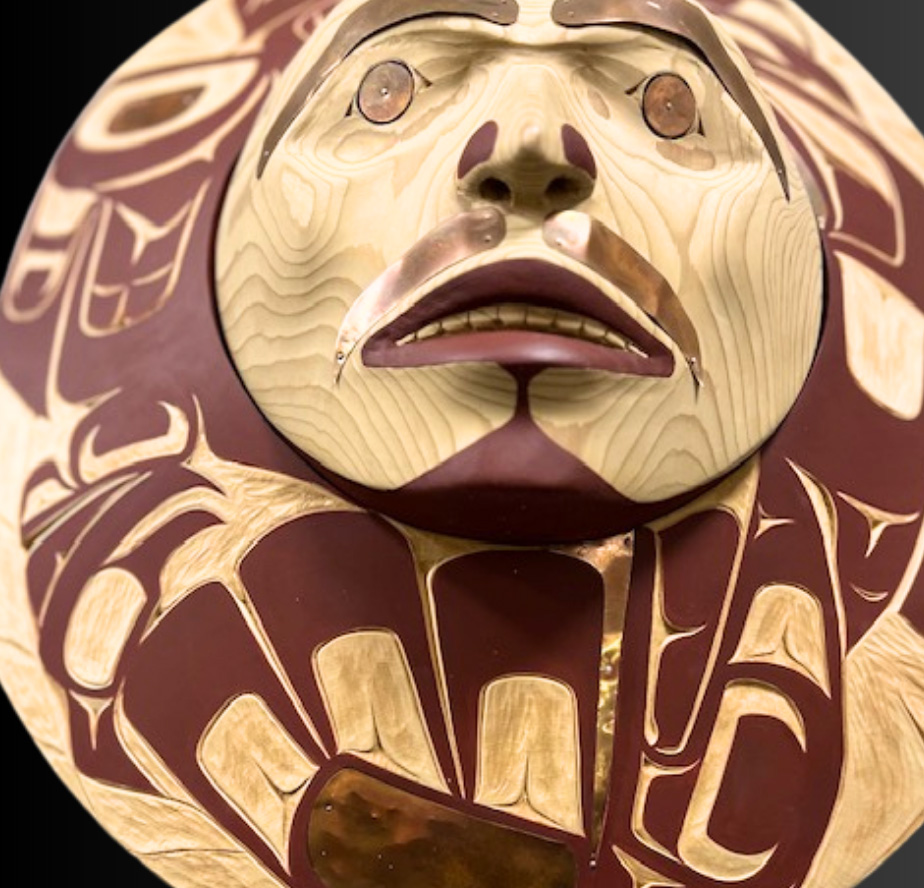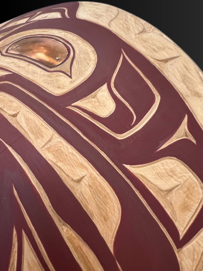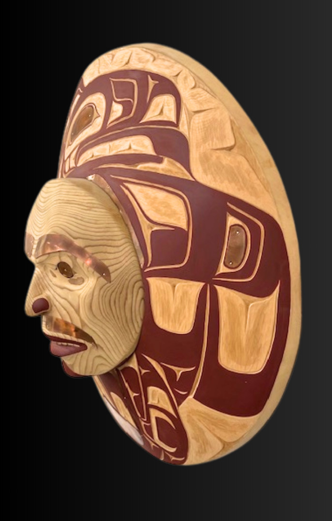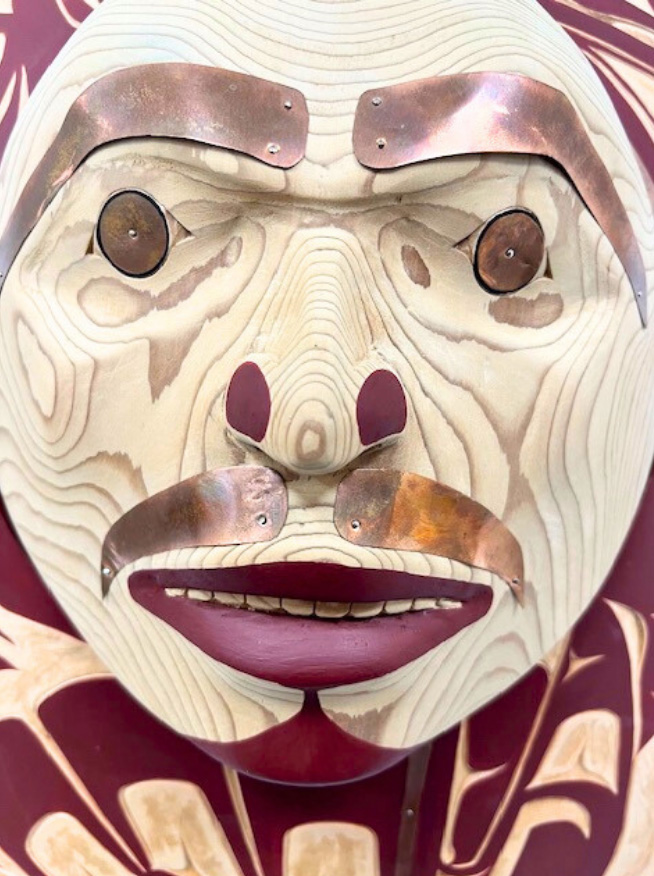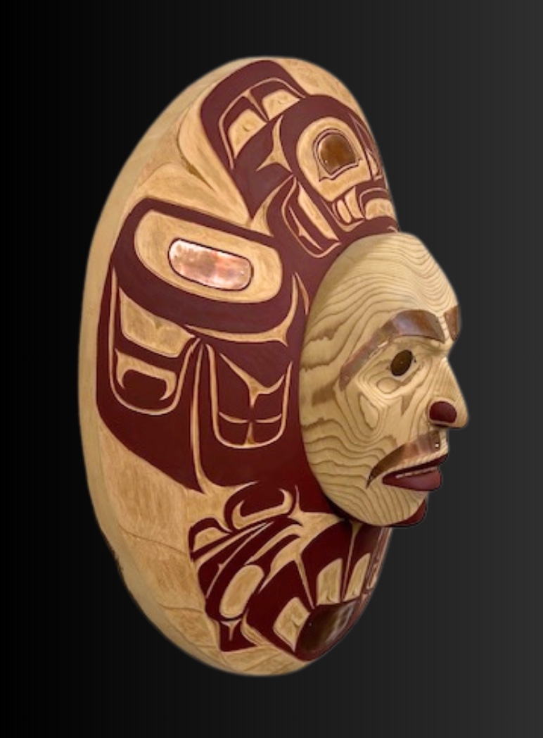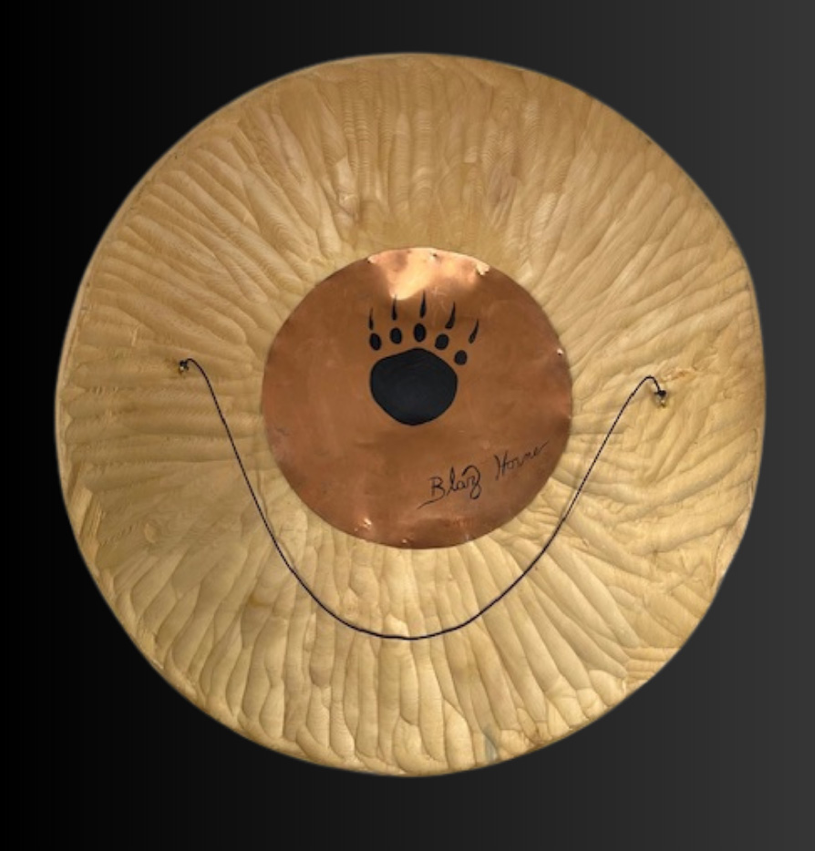 Tsimshian carver Blaz A. Horne created this exceptional Northwest Coast mask using two pieces of alder. The beautifully carved center face is encircled by a finely crafted eagle design detailed and given subtle texture by Blaz’s distinctive knife work. He has also added contrasting features with copper inlay and reddish brown acrylic pigment to complete this beautiful, one-of-a-kind mask.