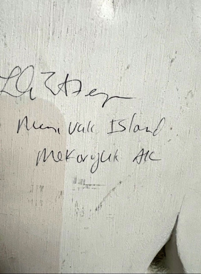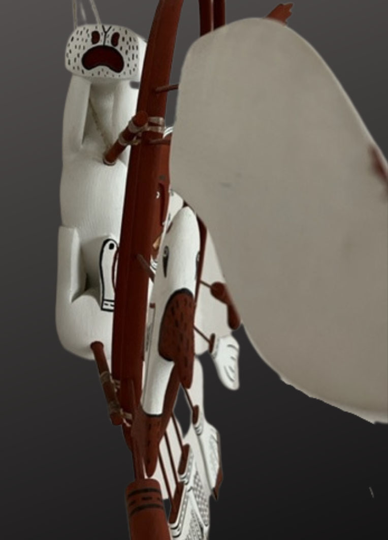 This wonderful Nunivak Island mask was created by Lola Smith Ferguson using an original “Double Walrus” design by her late father, the renowned carver Peter Smith. This mask is handcrafted out of driftwood. Lola makes her hoops by hand by bending them around a pattern and each appendage is attached with sinew. She uses traditional methods of gathering the pigments to make the paint she uses. The mask is signed.