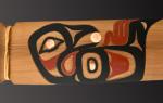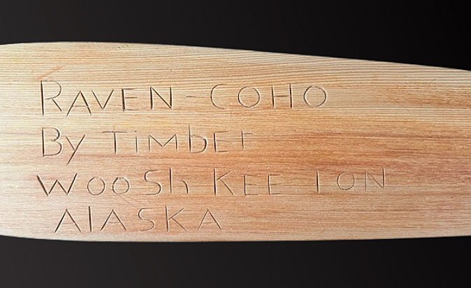 The beautifully carved and painted red cedar paddle is by Tlingit carver, Timber “Woosh Kee Ton” Vavalis. His original Northwest Coast raven and coho designs are accented with copper. The piece is signed and ready to hang.