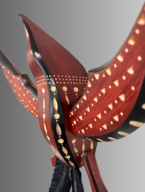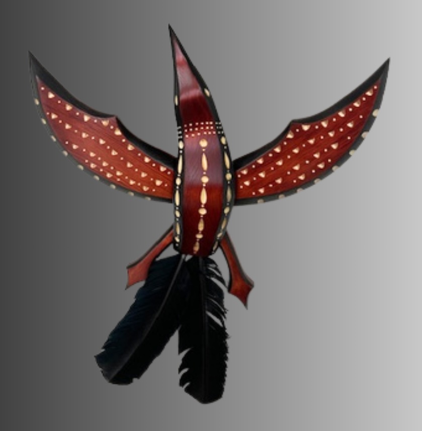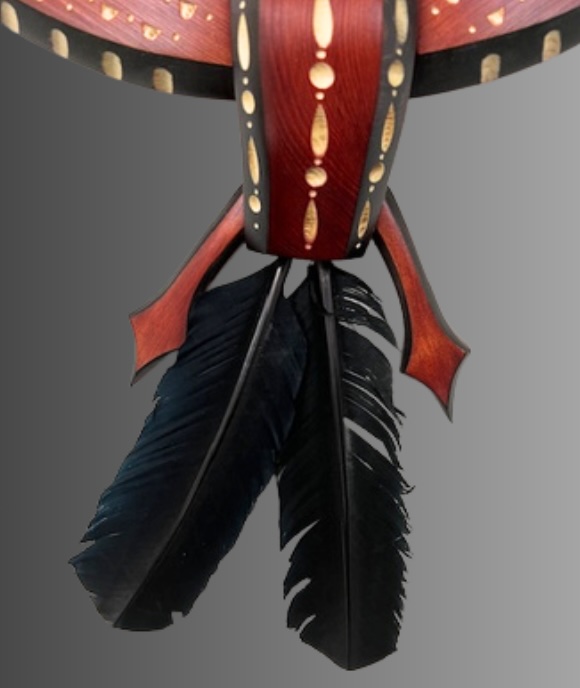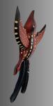 Alaska yellow cedar dyed reddish brown, domestic dyed feathers