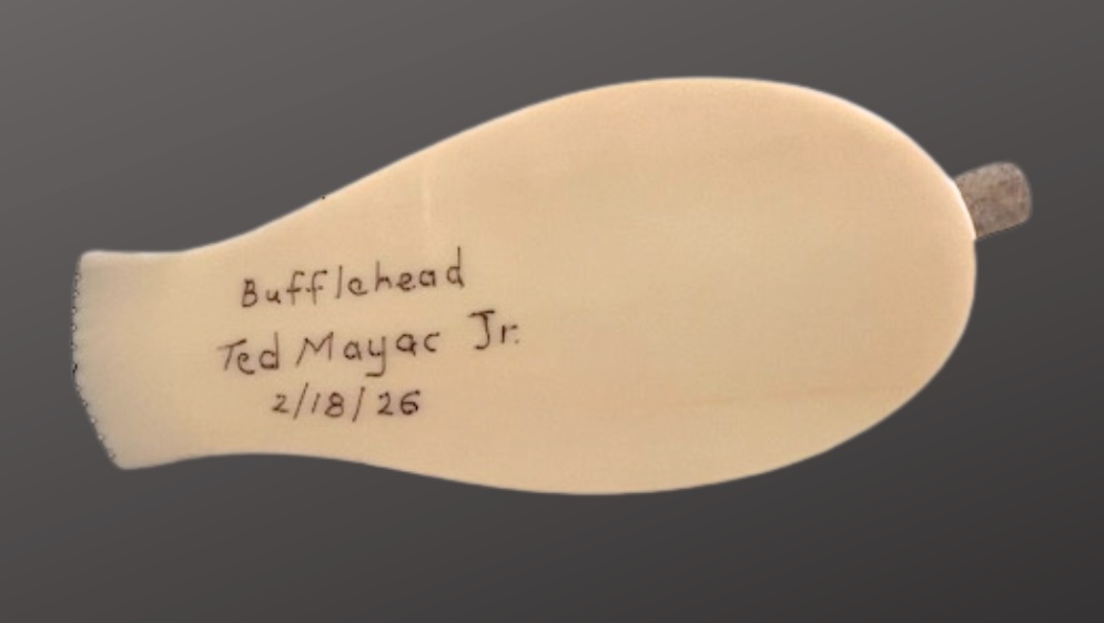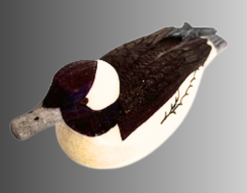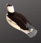 This beautifull Bufflehead is carved from walrus ivory by Ted Mayac Jr. from King Island, Alaska. The Mayac's are renown for their walrus ivory carvings of birds and ducks. This piece exemplifies Ted's attention to detail, using several hand etching tools to create different lines, textures, and effects. Ted uses permanent inks and colored markers to replicate the natural colors of the Bufflehead duck. The piece is signed and dated.