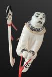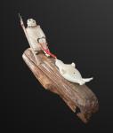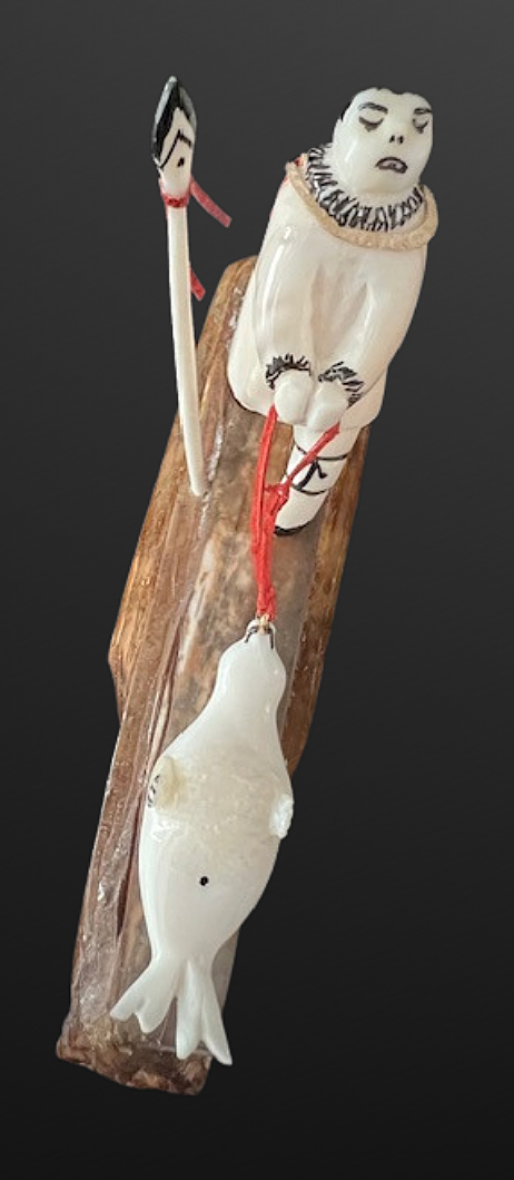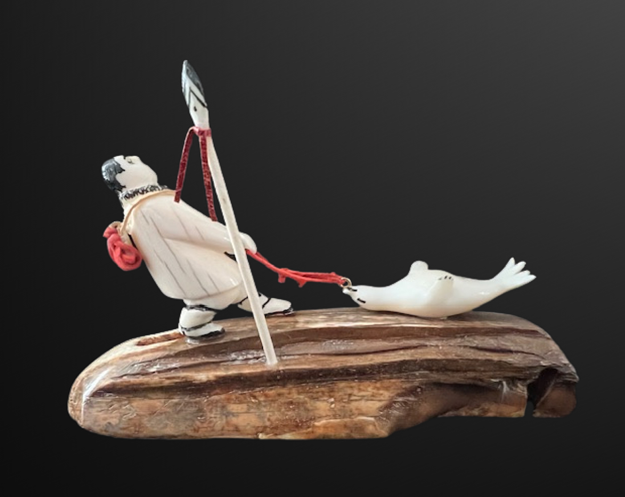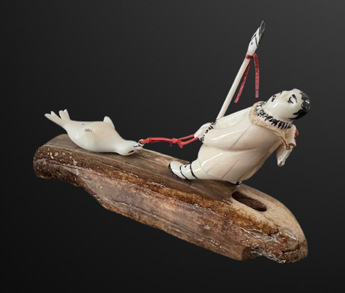 Mary Seppilu, Yupik carver from St. Lawrence Island, created this imaginatively carved scene of a hunter pulling a seal. Carved from walrus ivory, the figure and his catch sit atop an artifact - a fossil walrus ivory sled runner. This piece is expressively detailed and is a terrific example of Mary's unique work.