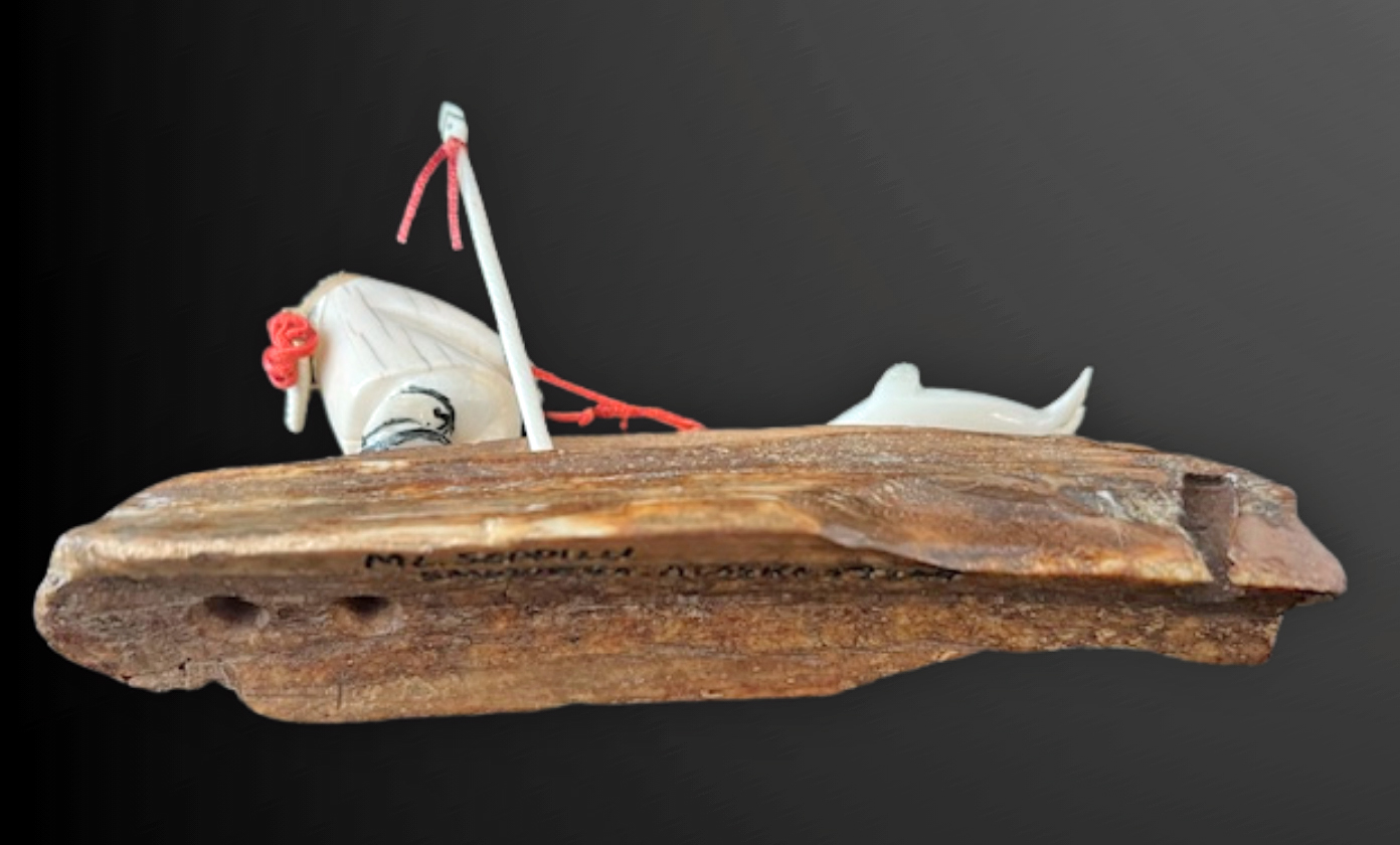 This is a collector's piece and is signed ML Seppiu, Savoonga, Alaska 99769 (the zip code). It would make a fine addition to any Northern Alaska art collection.