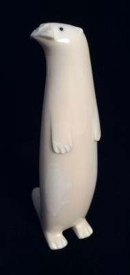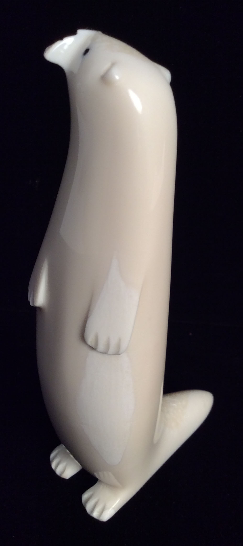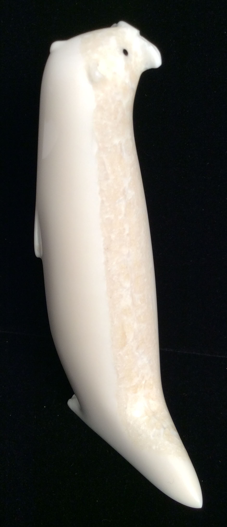 Yupik artist Brendan Oseuk carved this delightful standing otter. This whimsical animal is made from polished walrus ivory with inlaid baleen eyes. The variations in the color of the walrus tusk creates a visual texture and gives character to this wonderful creation.