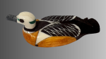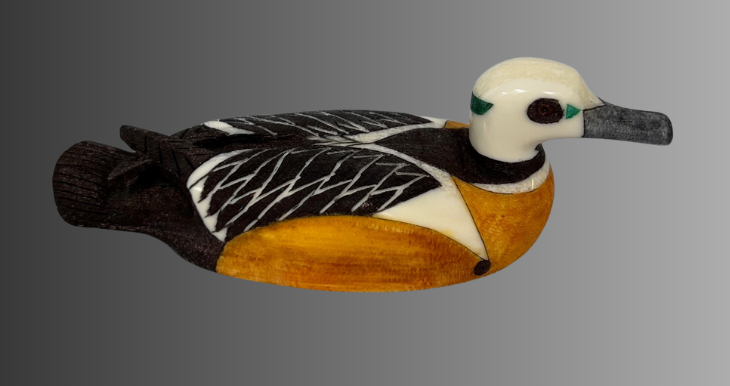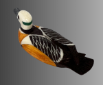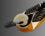 Carved by Ted Mayac Jr., King Island, Alaska, this wonderful male (drake) Steller's Eider is created from walrus ivory by Ted Mayac Jr. The Mayac's are renown for their walrus ivory carvings of birds and ducks. This piece exemplifies Ted's attention to detail, using several hand etching tools to create different lines, textures, and effects. Ted uses permanent inks and colored markers to replicate the natural colors of male Steller's Eider. The piece is signed and dated.