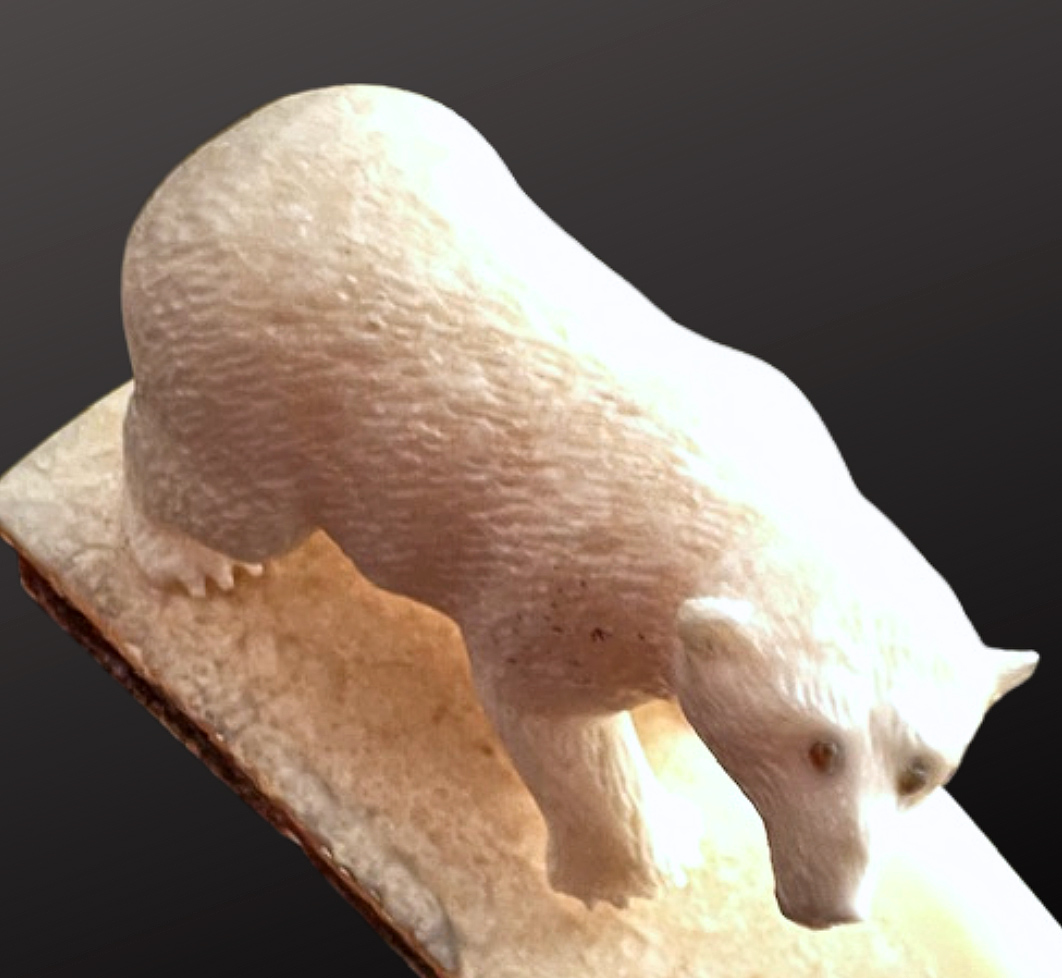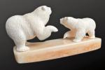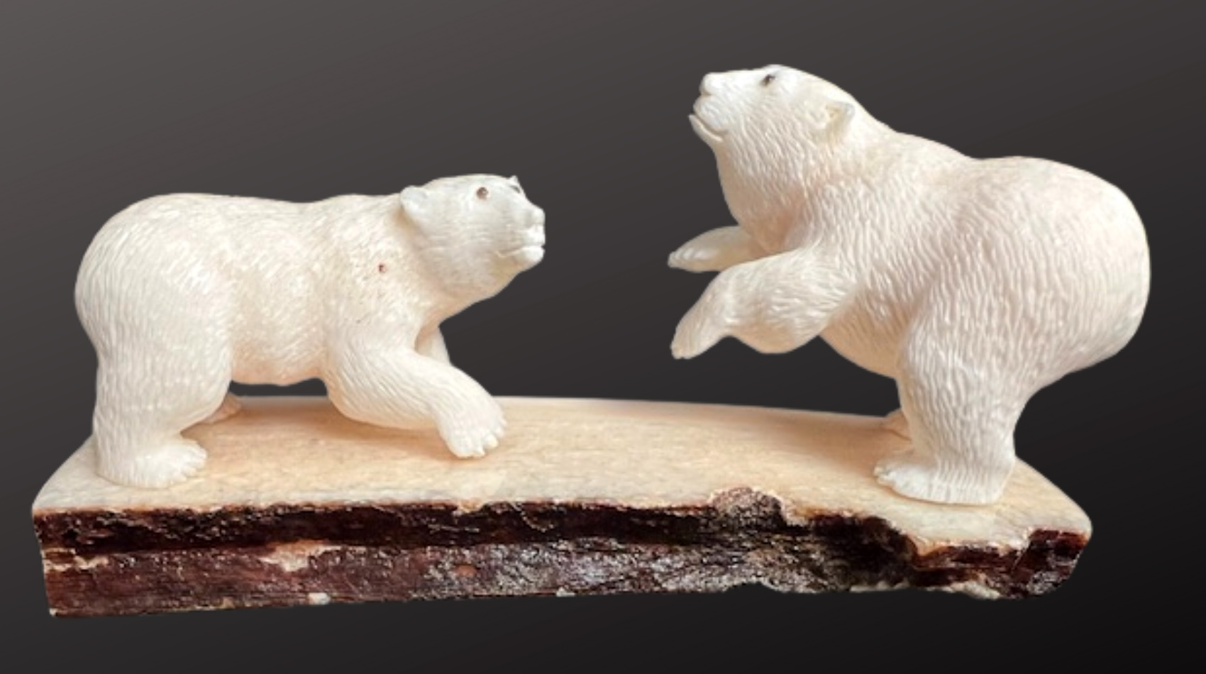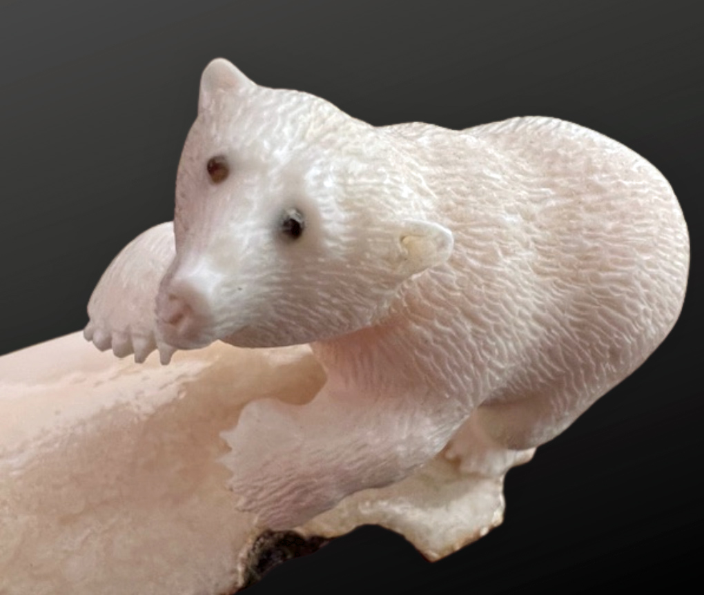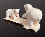 Wilson Ifkaaqu Okoomealingok, Siberian Yupik, carved this lively encounter of two polar bear cubs playing from walrus ivory. Wilson inlays baleen to depict the bear’s eyes. This type of activity scene from Wilson’s Savoonga home is a familiar subject of his carvings. The duo is mounted on a fossilized walrus ivory base.