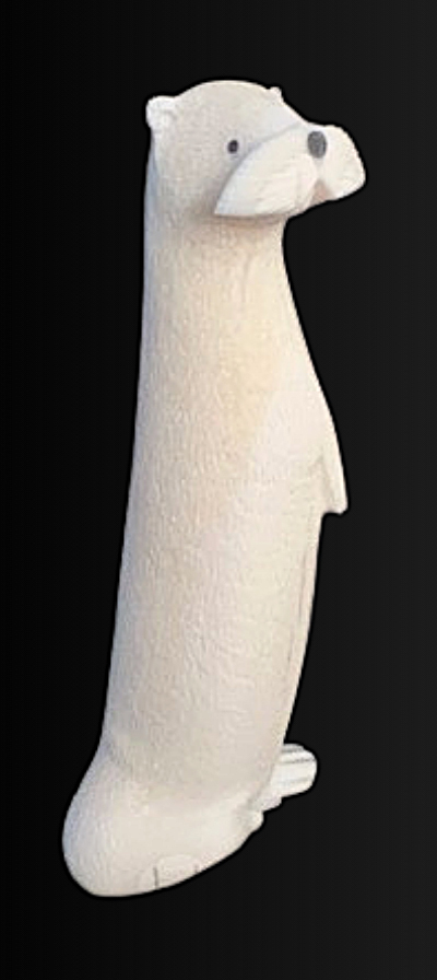 Ronald Apangalook, a Siberian Yupik artist from the village of Gambell, Alaska created this wonderful, finely carved standing sea otter from walrus ivory. Ronald selected a beautiful piece of ivory, carving texture to depict the otter’s dense, water-resistant fur. He inlaid baleen to define the otter’s nose and eyes.
